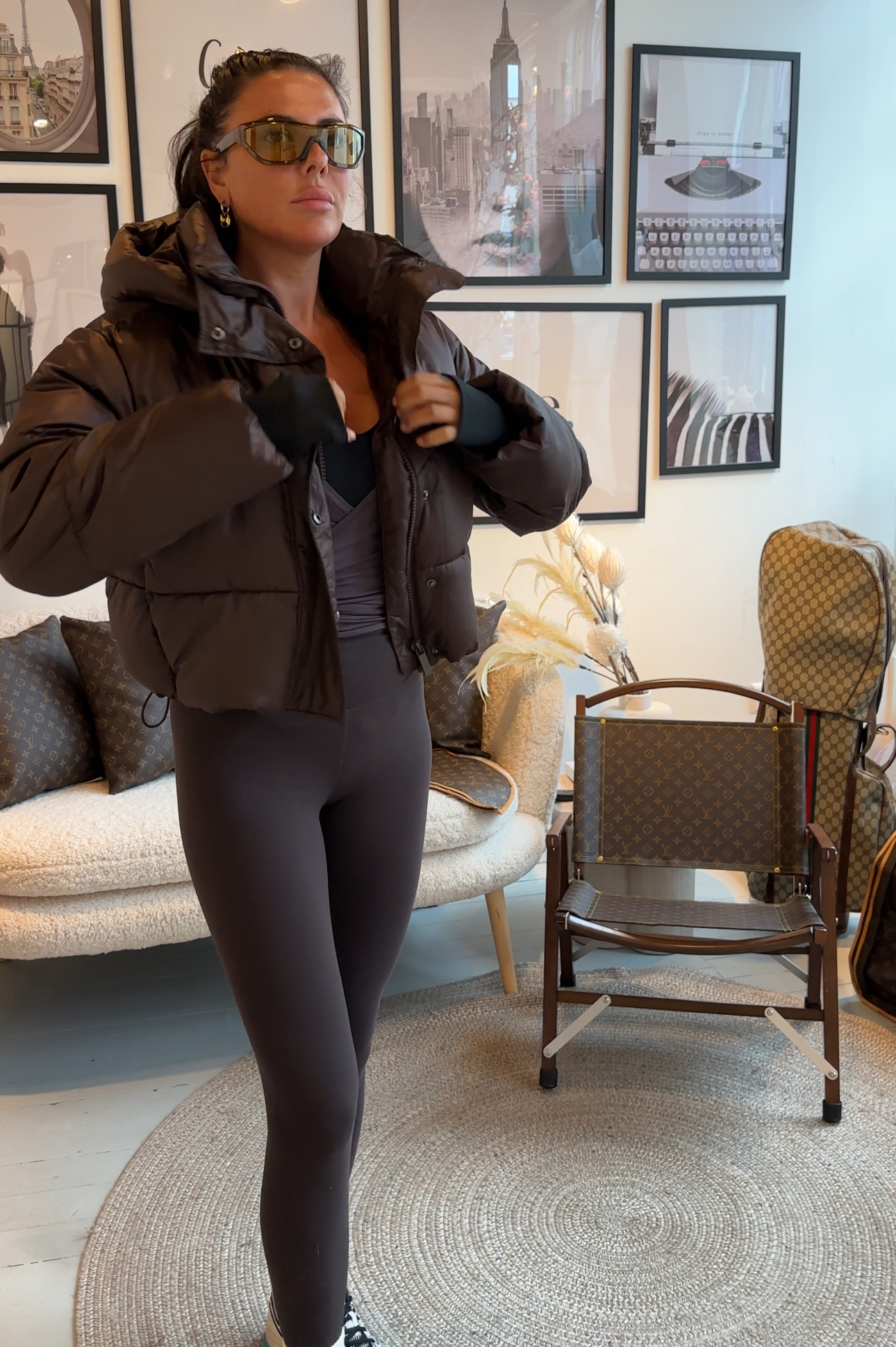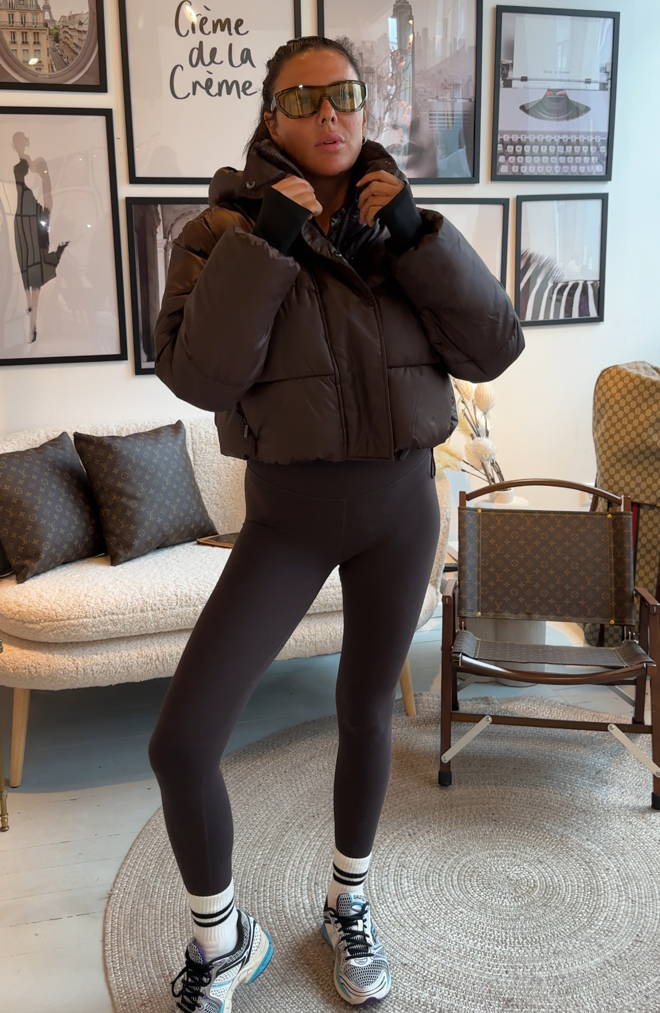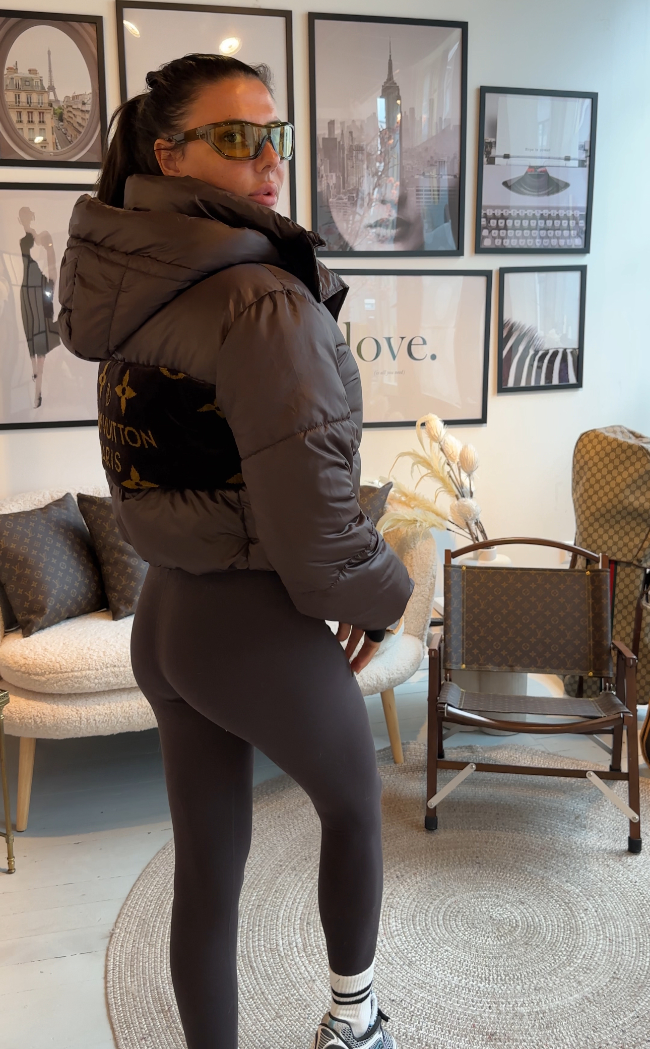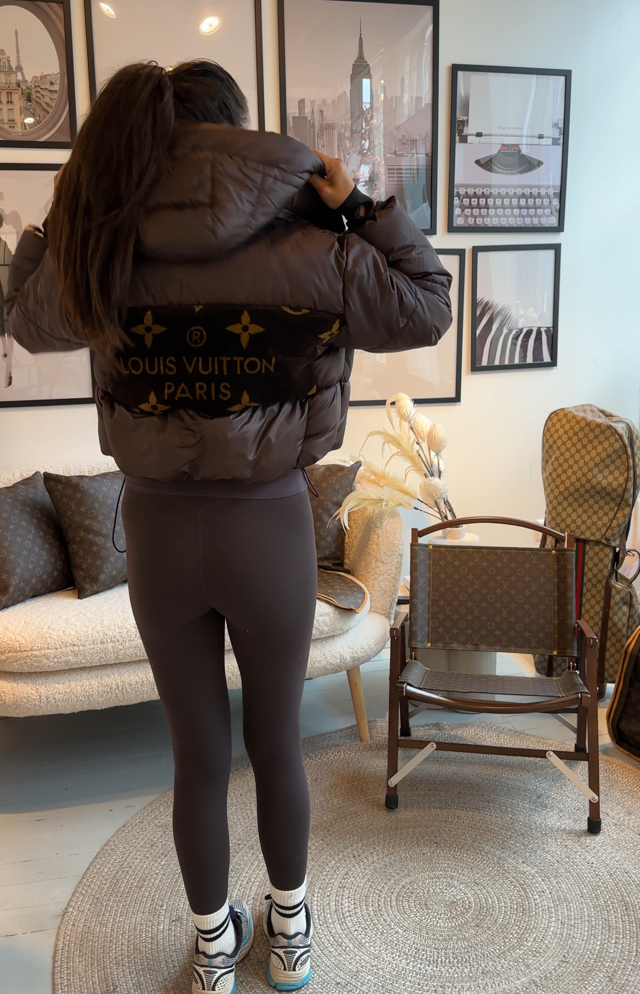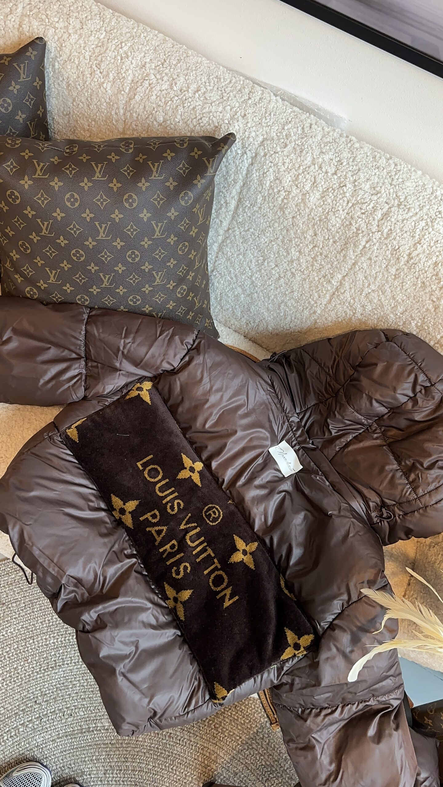 This limited edition puffer is a true statement piece. Designed in a rich brown tone and featuring authentic vintage designer Teddy velvet fabric on the back, originally sourced from a Louis Vuitton item.