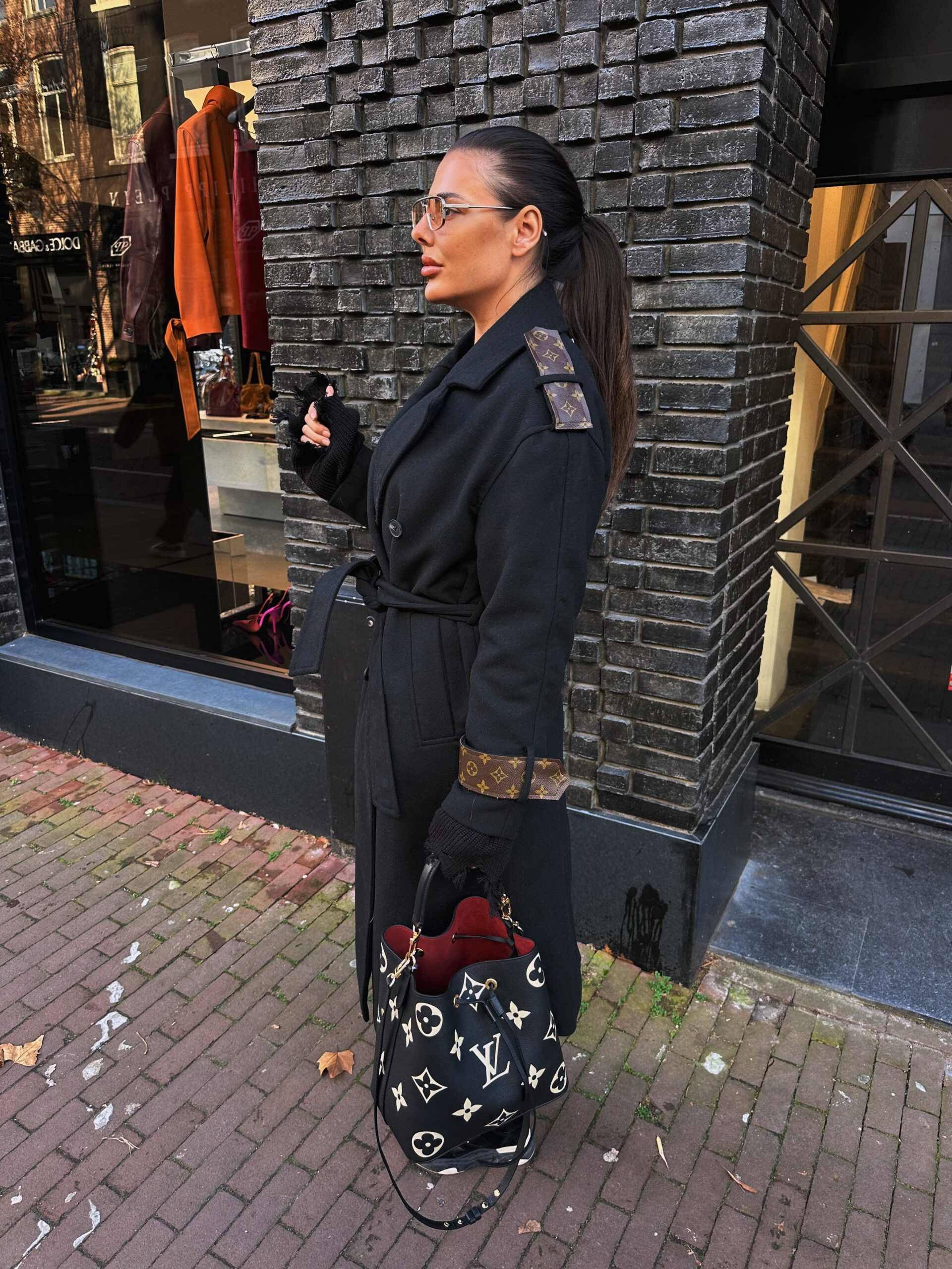 A luxurious long coat made from premium vintage designer material, featuring exclusive detailing on the shoulders and cuffs. Each piece is handmade with care, giving it a unique and timeless character. The perfect blend of elegance, comfort, and sustainable craftsmanship.