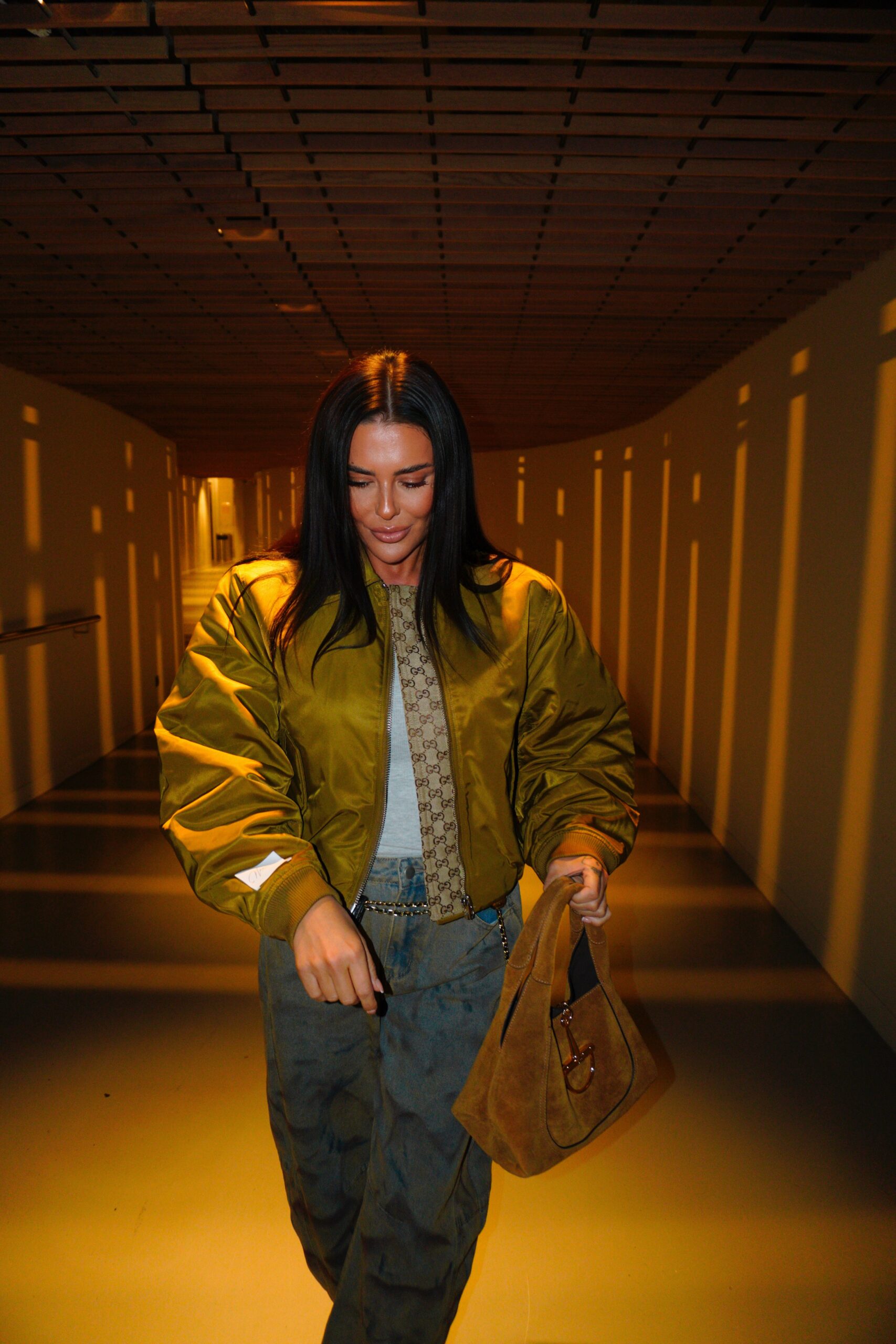 Our greenish / brown bomber jacket is a slightly shorter, lightly padded silhouette designed to feel warm, effortless and elevated. Finished with a structured collar, subtle pleated seam details, ribbed cuffs and hem, and two angled flap pockets with zip closure. Oversized fit. Naomi is wearing size S/M and used fabric nr 3.